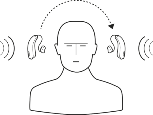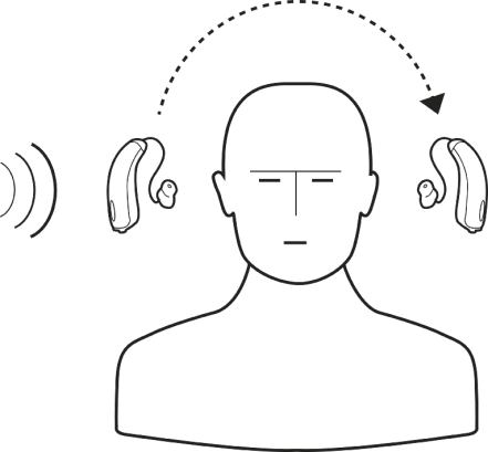 WIDEX Bi-CROS hearing aids system wirelessly transmits sound from the side with severe hearing loss to the side with better hearing via a transmitter, which is placed behind the deaf ear. The transmitter picks up sound and wirelessly transmits it to a receiver hearing aid on the normal-hearing ear.